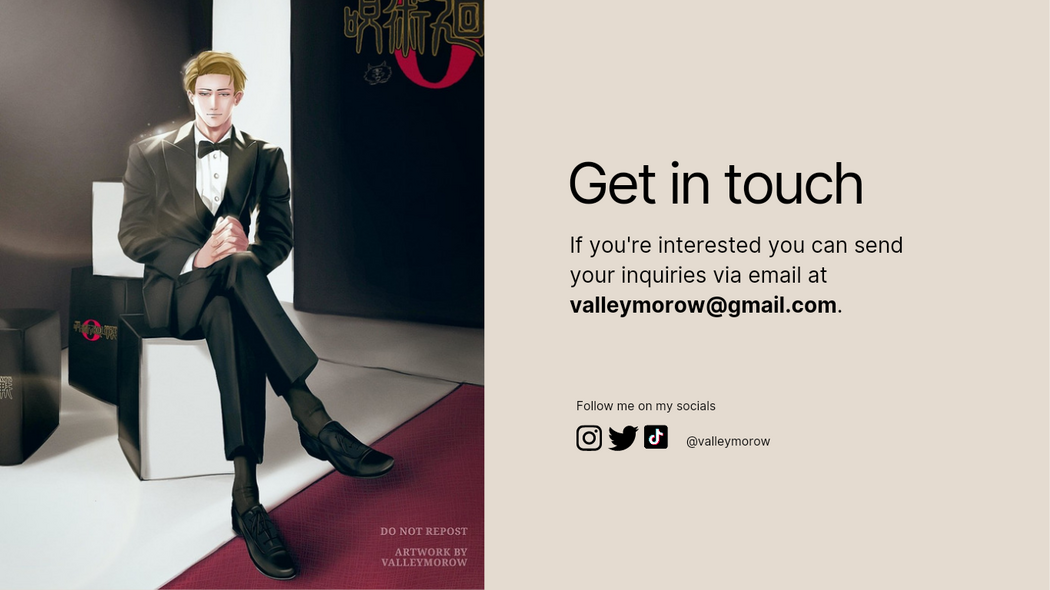 If you wish to contact me outside of my socials you can do so through my email.Replies may take about 2-3 business days